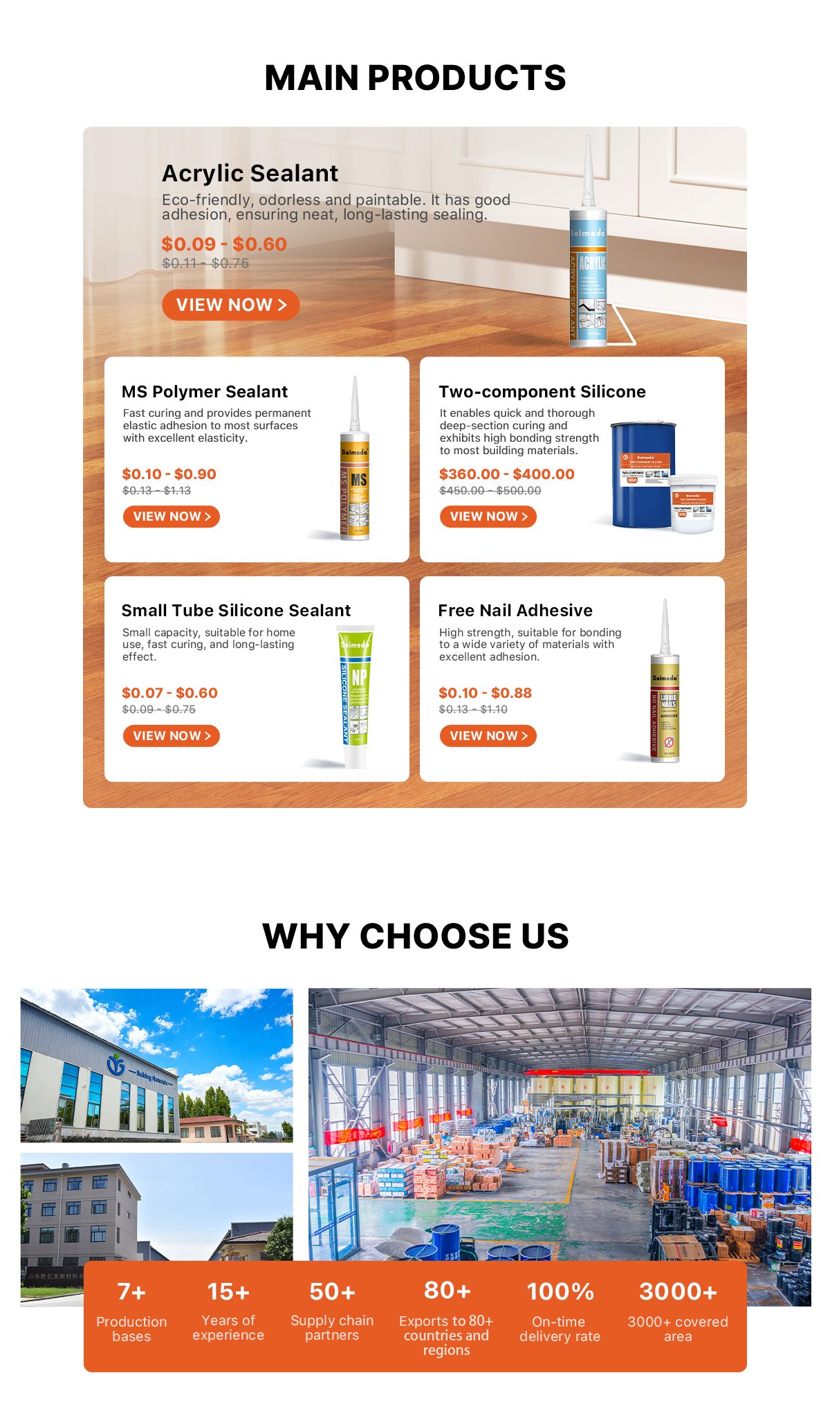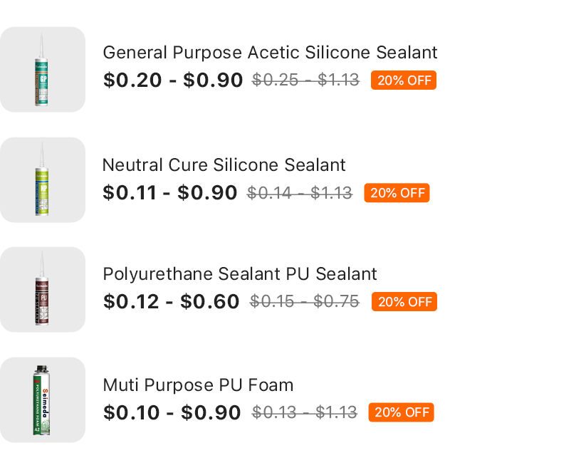 Основные продукты:Силиконовый герметик, жидкие ногти, PU пена, акриловый герметик, MS полимер